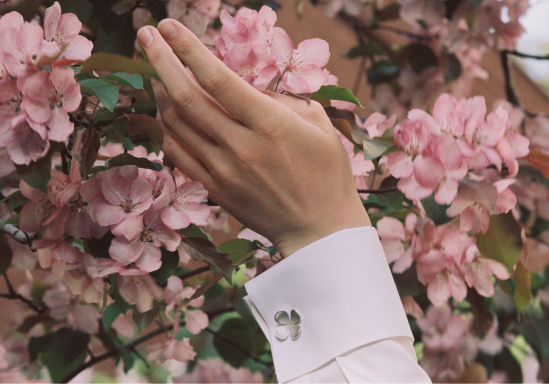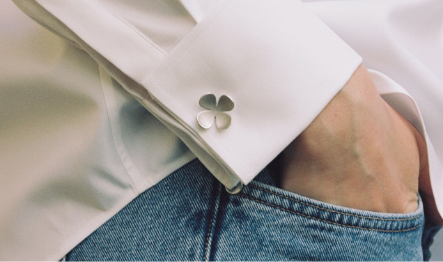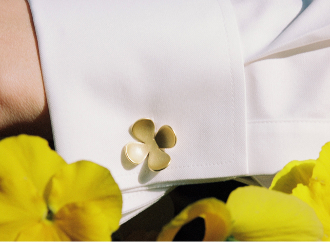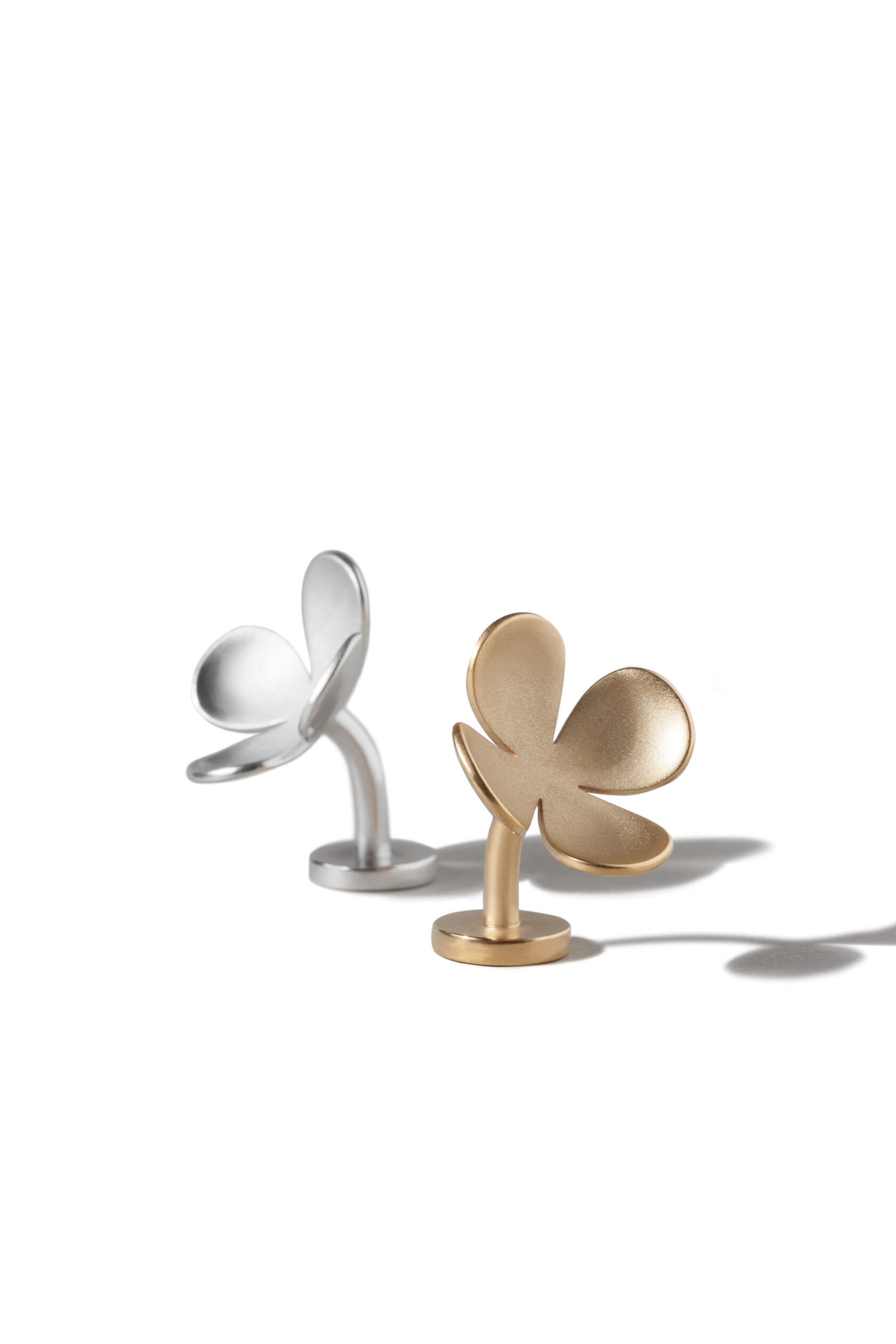 Запонки в форме узнаваемого четырехлистного цветка alvaar. Полураскрытый цветок, который немного отличается от классического цветка alvaar, символизирует для нас созидание и путь к расцвету.
